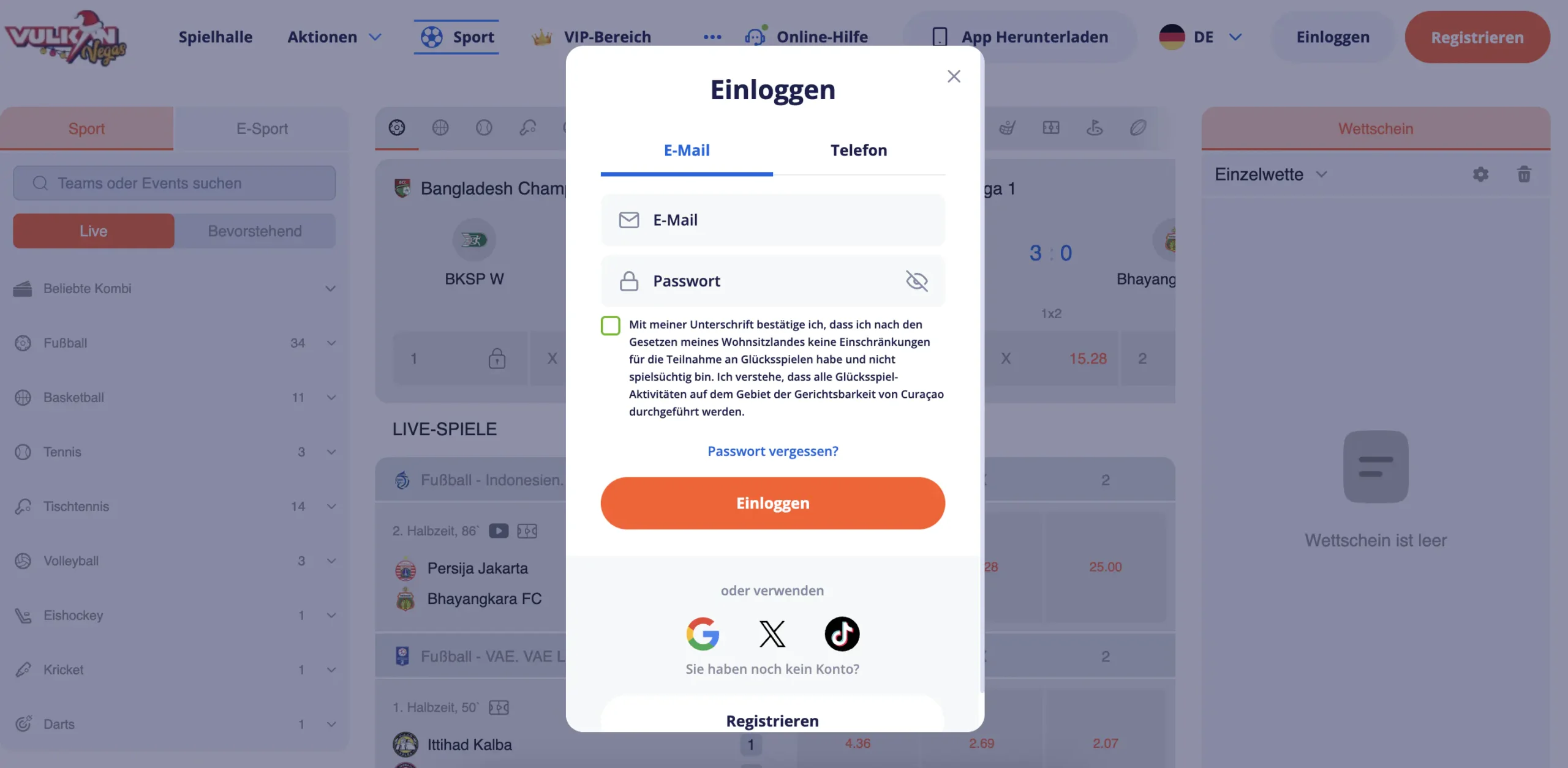 - Zugangsdaten eingeben: Wir geben die bei der Registrierung verwendete E-Mail-Adresse sowie unser Passwort ein. Diese Kombination ist für den vulkanvegas login erforderlich.